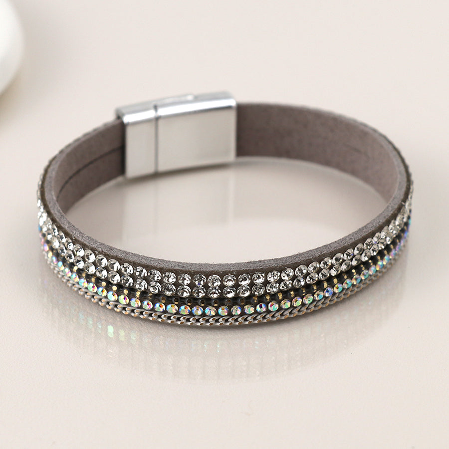 Choose from; Grey leather, clear crystal and silver chain or Dark emerald green, clear crystal and golden chain
